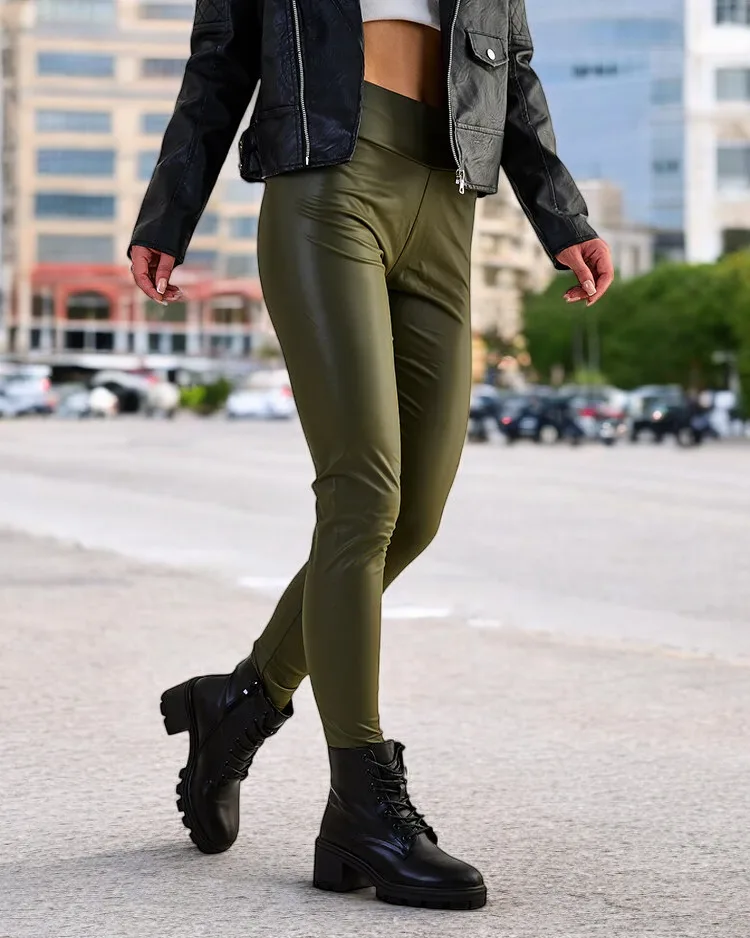 - Klasické legíny z klzkej tkaniny a'la koža. Nohavice majú vysoký pás a široký elastický pás. Ideálny základ pre štýlové outfity! UPOZORNENIE: Presnosť merania (+/-) 1 cm.