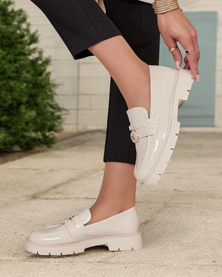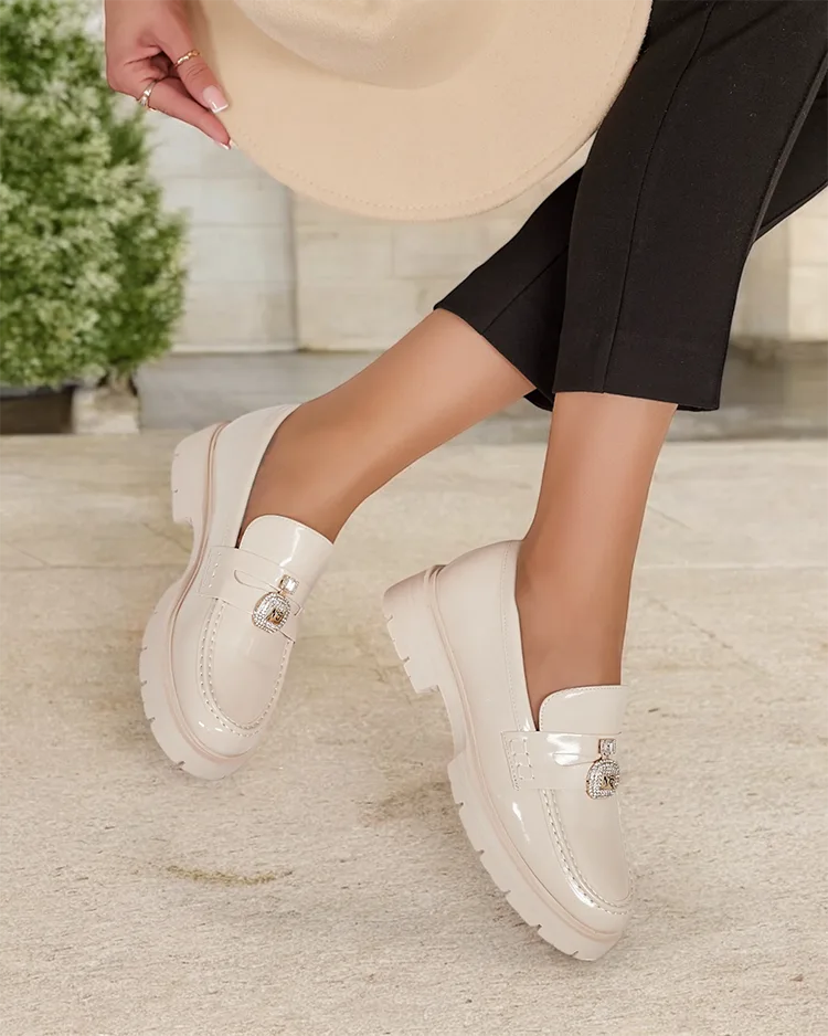 • Klasické dámske mokasíny na plochom podpätku. Model je vyrobený z ekologickej lakovanej kože, stielka je z ekologickej kože. Obuv má na zvršku jemné zdobenie. Ideálny základ na každý deň!