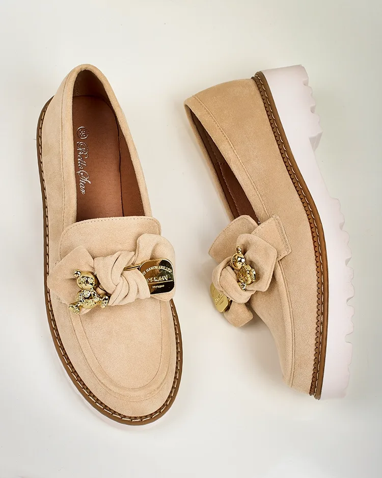 - Klasyczne damskie półbuty typu mokasyny na niewielkiej platformie. Model wykonany ze skóry ekologicznej zamszowej oraz eko skórzanej wkładki. Nosek zdobiony kokardką. Must have w szafie każdej kobiety!