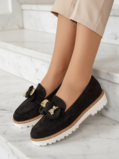 - Klasični ženski mokasini na majhni platformi. Model je izdelan iz ekološkega semiš usnja in vložka iz eko usnja. Prst je okrašen s pentljo. Must have v omari vsake ženske!