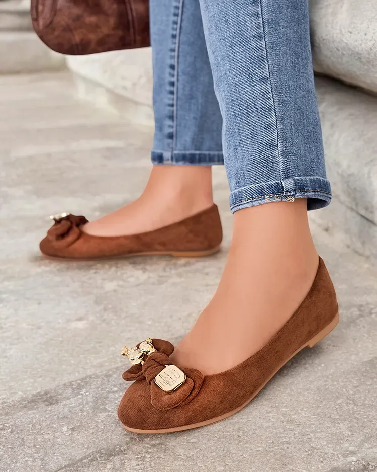 - Dámske baleríny na plochom podpätku z ekologickej semišovej kože a stielkou z ekokože. Model má okrúhly nos s ozdobnou mašľou. Super doplnok k vašim ležérnym outfitom!