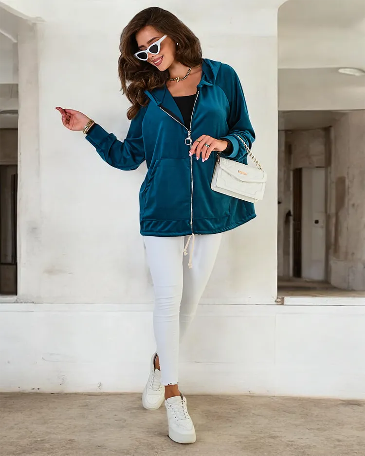 - Klasická dámska mikina na zips a'la velúr. Model má kapucňu, dve vrecká a lemy v spodnej časti a na rukávoch. Ideálna pre každú ženu! UPOZORNENIE: Presnosť merania (+/-) 1 cm.