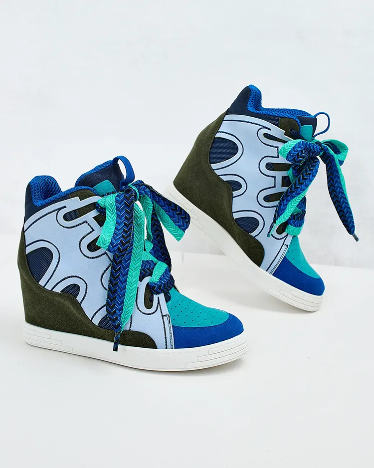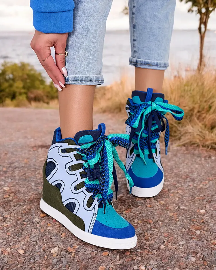 - Športové dámske čižmy na podpätku, vyrobené z kombinácie ekokože a ekosemišu. Obuv sa zaväzuje na ozdobné šnúrky, vnútri stielka z ekokože.