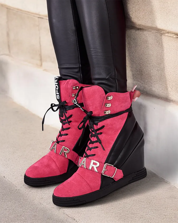 • Športové dámske čižmy na podpätku, vyrobené z kombinácie ekokože a ekosemišu. Viazané topánky s ozdobným vzorom na zvršku, vnútri látková stielka.