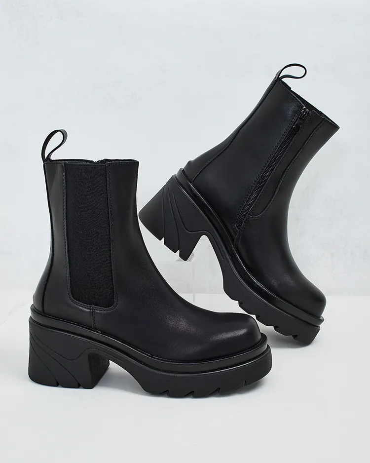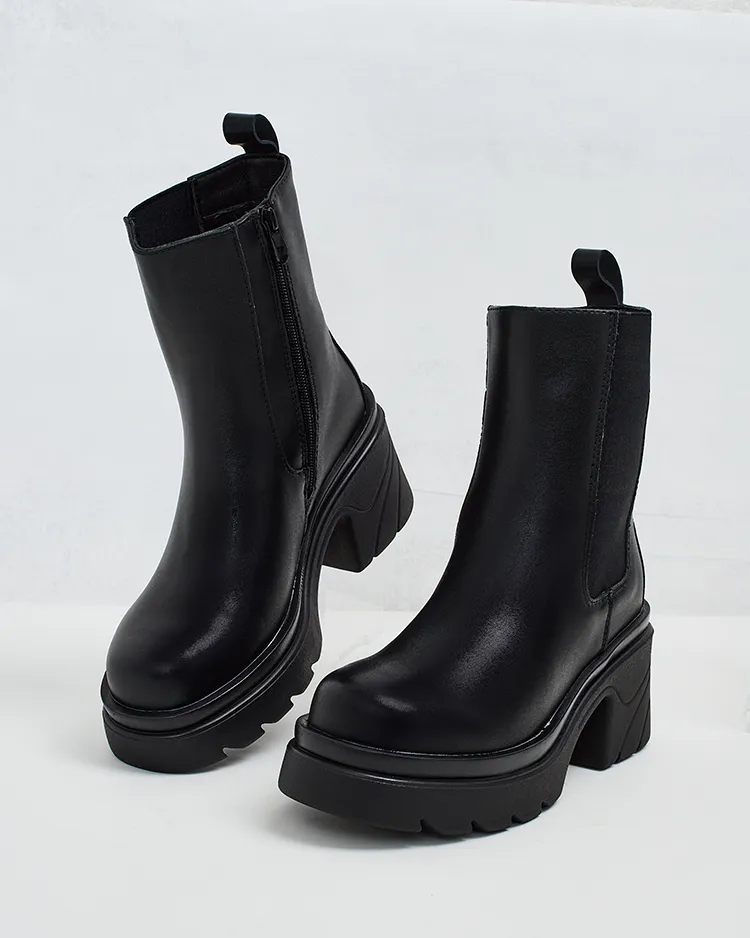 - Vysoké čižmy pre ženy na hrubšej platforme. Obuv kompletne vyrobená z ekologickej kože. Topánky sa zapínajú na zips. Ideálna voľba na jeseň!