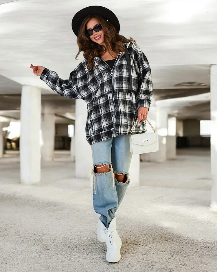 • Štýlový dámsky kabát košeľového typu s kapucňou. Kabát nadrozmerného strihu má dlhé rukávy, zapínanie na zips a 2 vrecká. Skvelý na jeseň!