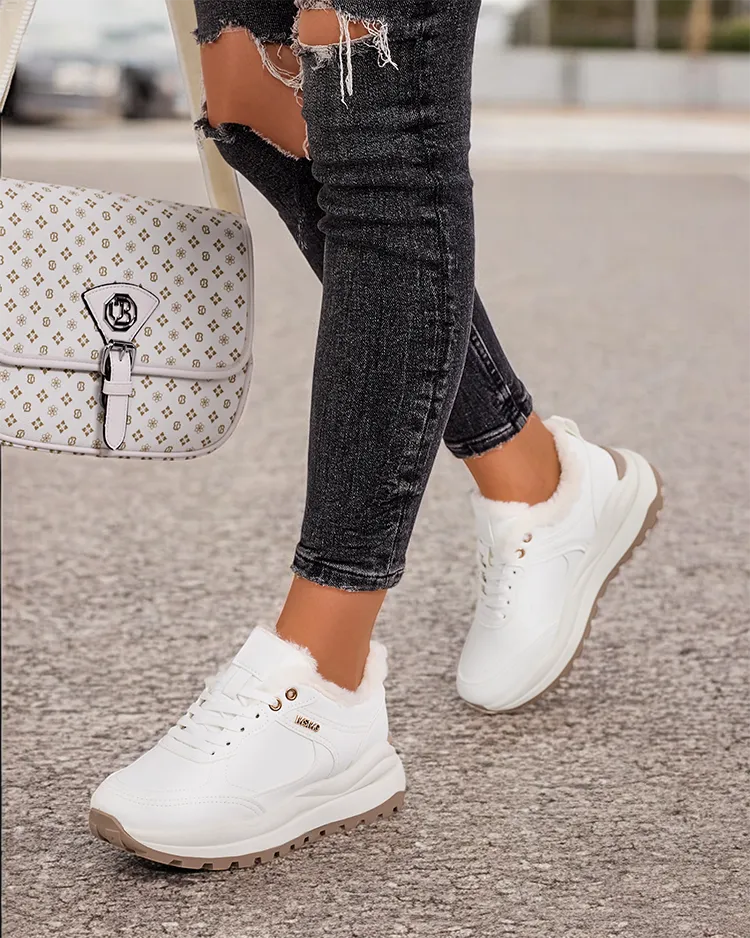 • Dámske zateplené športové tenisky na hrubšej podrážke. Šnurovací zvršok z eko nubuku v kombinácii s eko kožou. Mäkká kožušina vo vnútri. Super doplnok k vašim zimným ležérnym outfitom!