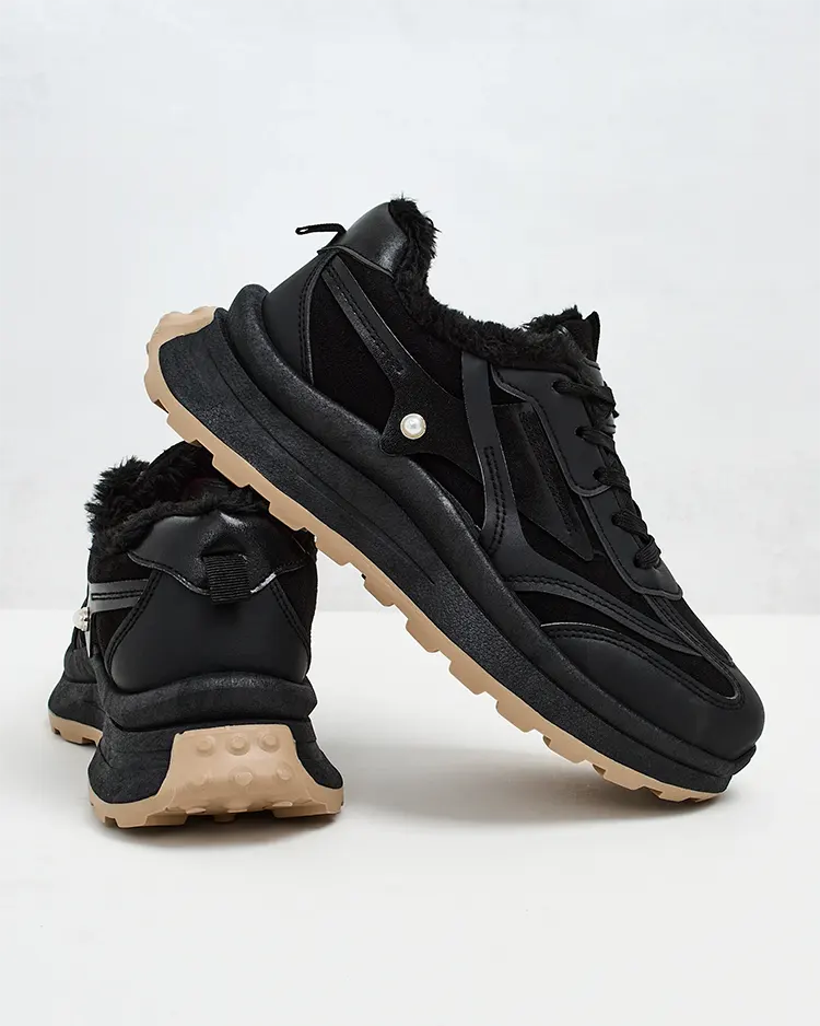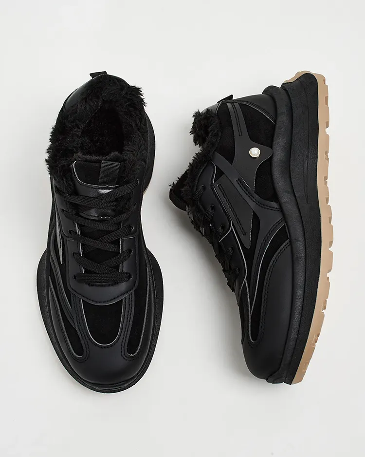 - Dámska zateplená športová obuv na hrubšej podrážke. Šnurovací zvršok zo semišovej ekologickej kože s prvkami z ekokože. Mäkká kožušina vo vnútri. Super doplnok k vašim zimným ležérnym outfitom!