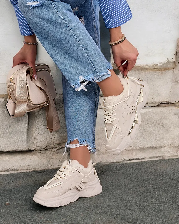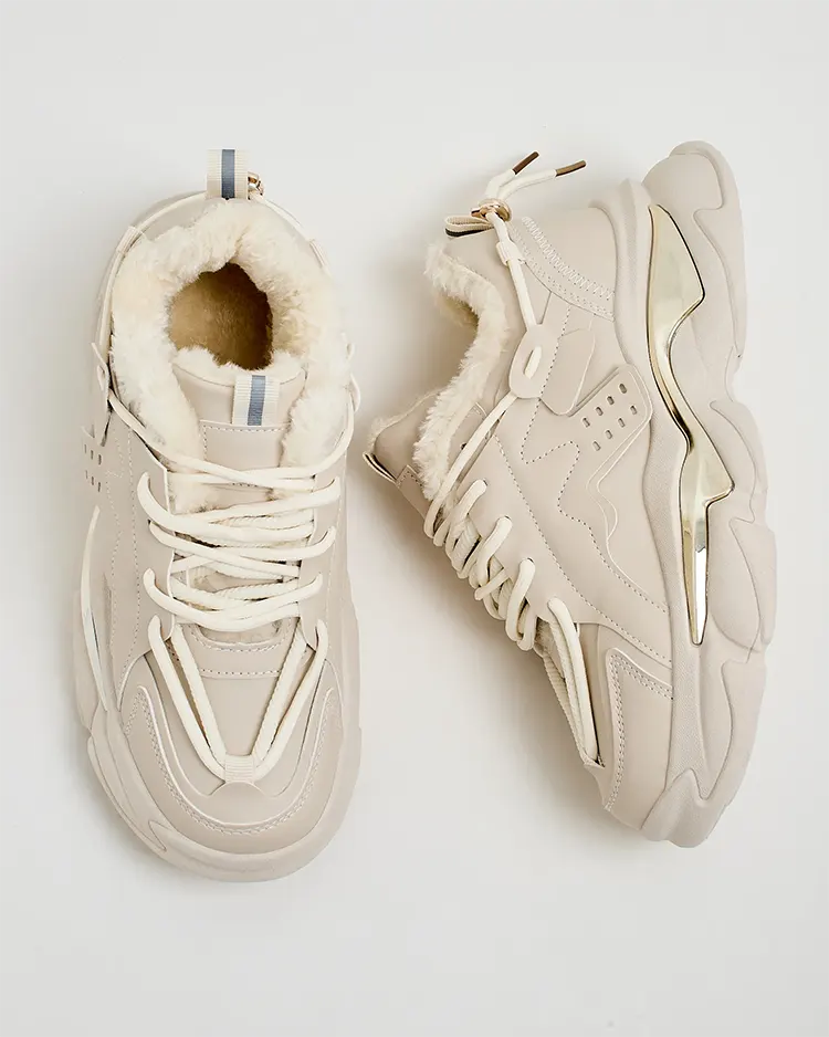 - Dámske športové tenisky na hrubšej podrážke. Šnurovací zvršok, vyrobený z ekologickej kože. Vnútro plne zateplené kožušinou. Ideálne k športovým outfitom!