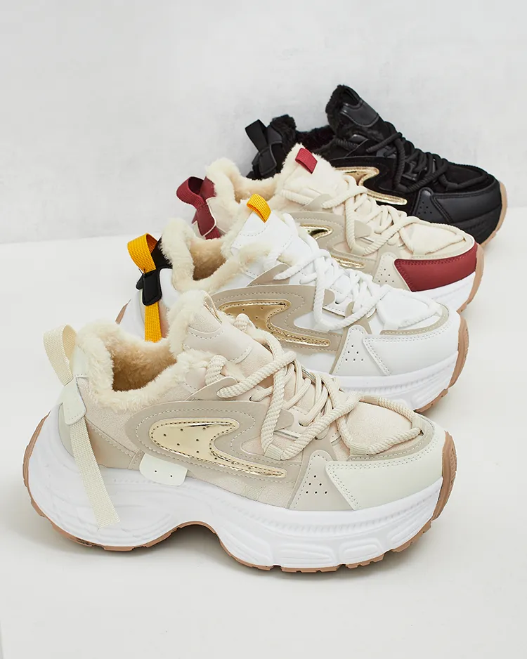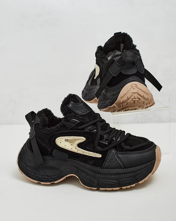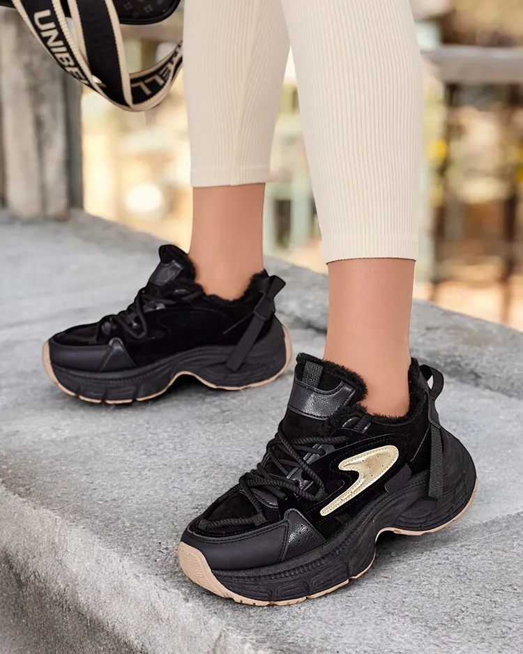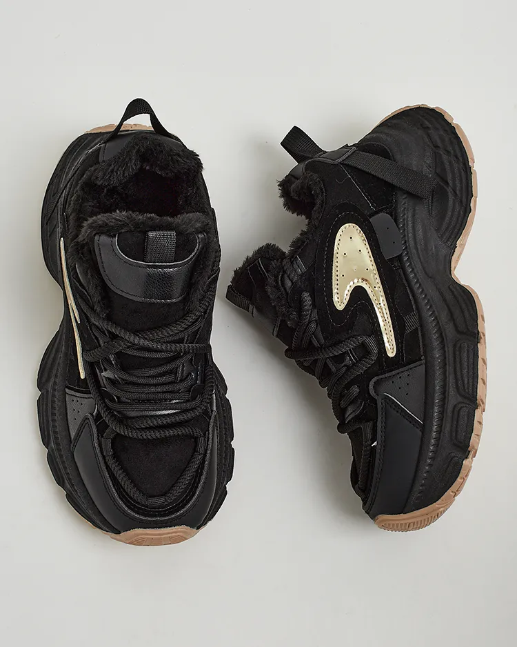 - Dámska zateplená športová obuv na hrubšej podrážke. Šnurovací zvršok zo semišovej ekologickej kože s prvkami z ekokože. Mäkká kožušina vo vnútri. Super doplnok k vašim zimným ležérnym outfitom!
