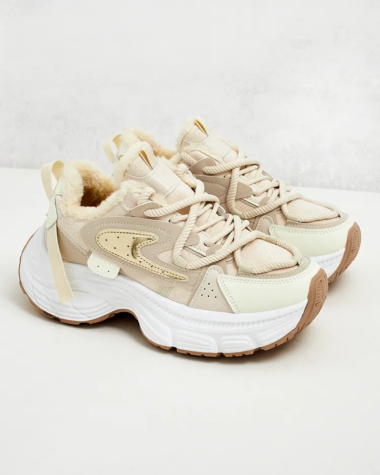 - Dámska zateplená športová obuv na hrubšej podrážke. Šnurovací zvršok zo semišovej ekologickej kože s prvkami z ekokože. Mäkká kožušina vo vnútri. Super doplnok k vašim zimným ležérnym outfitom!