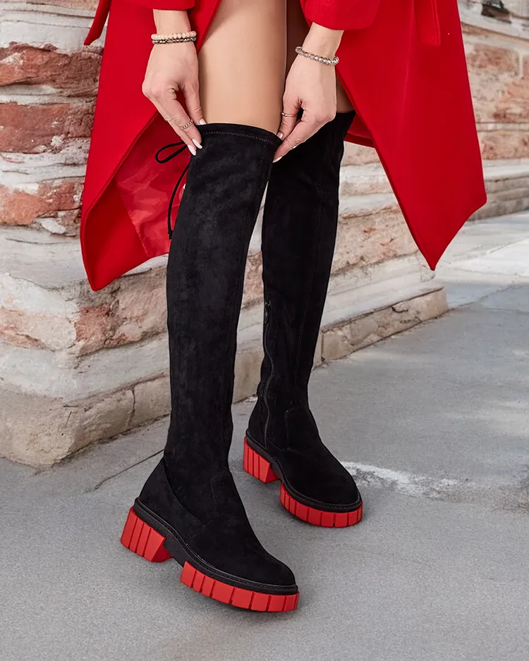 - Dlhé dámske čižmy na hrubšej podrážke, zvršok z eko-semišu. Model má kožušinovú stielku. Čižmy sa zapínajú na zips do polovice lýtka a majú lem. Ideálny základ pre mnohé zimné outfity!