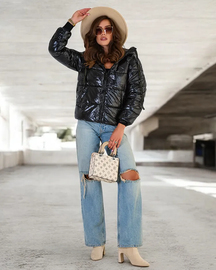 - Teplá dámska zimná bunda. Prešívaný model, má 2 vrecká na zips, syntetickú páperovú výplň a zapínanie na zips. UPOZORNENIE: Presnosť merania (+/-) 1 cm.