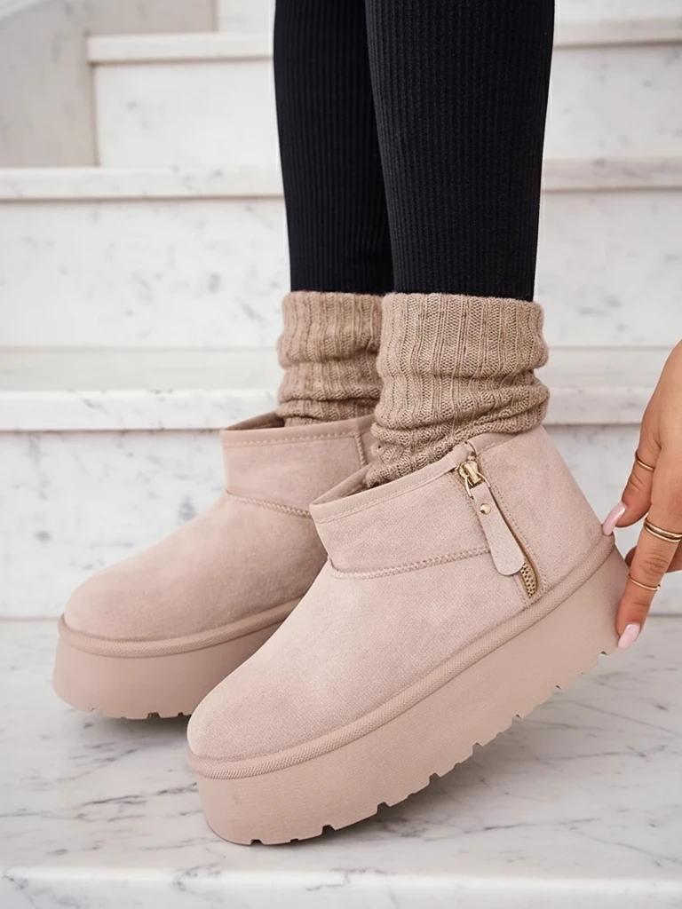 • Skvelé dámske zimné snehule na platforme. Zvršok je vyrobený z ekologickej semišovej kože, stred je zateplený kožušinou. Model má ozdobný zips. Ideálny základ na zimu!