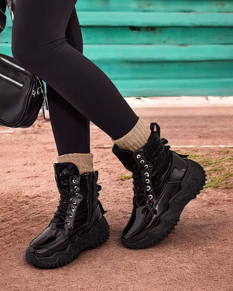 - Dámske snehule na platforme. Zvršok je vyrobený z kombinácie eko lakovanej kože a materiálu a'la cerata. Stred vyplnený mäkkou kožušinou. Model so šnurovaním. Pohodlné a štýlové!