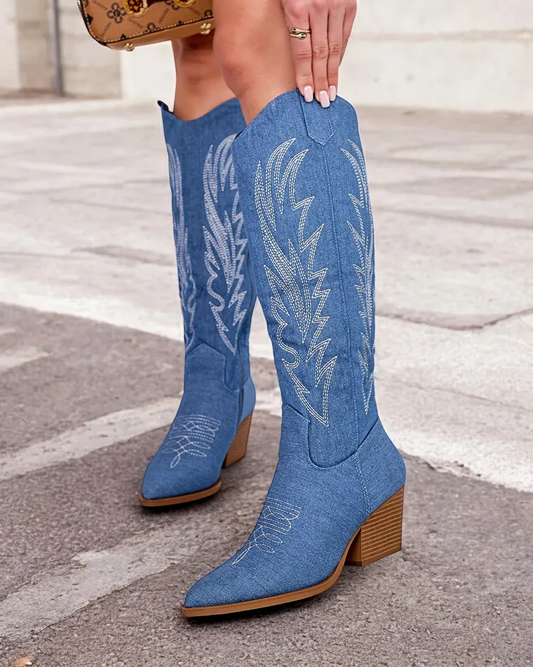 • Čižmy a'la kovbojské čižmy s nízkym podpätkom, vyrobené z príjemnej tkaniny s ozdobným razením. Látková stielka, čižmy so zipsom do polovice lýtka. Hodia sa k mnohým dámskym štýlom!