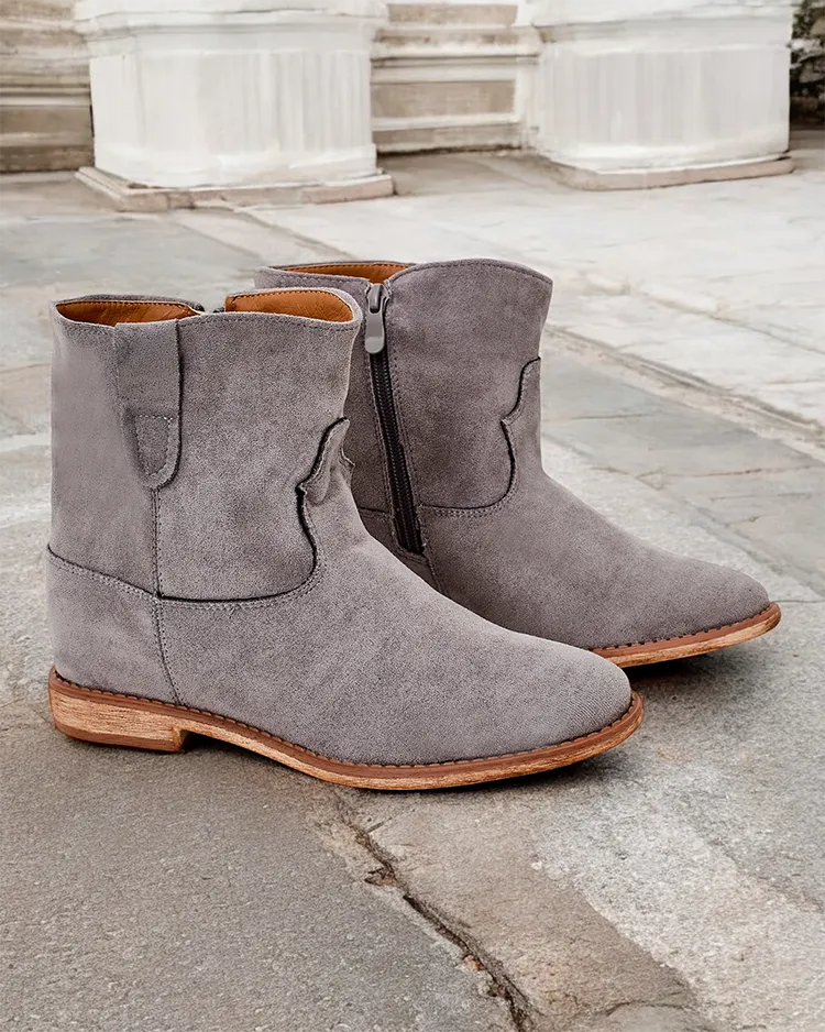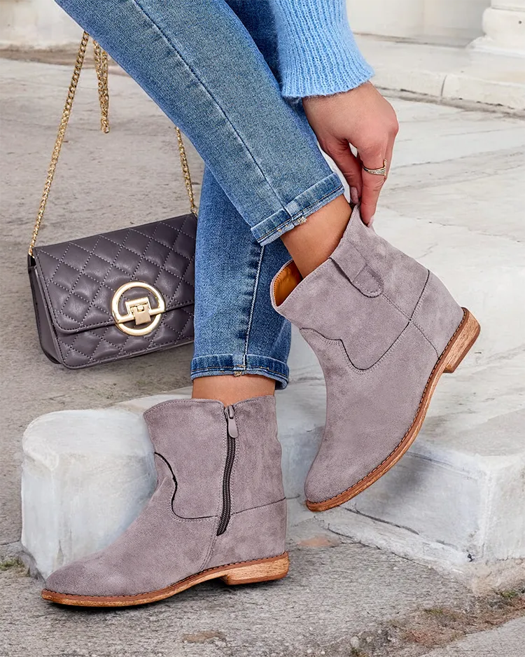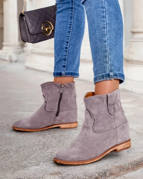 - Beige Západné topánky vyrobené z ekologickej kože podobnej semišu. Model má izoláciu vo vnútri vo forme mäkkej kožušiny. Obuv na nízkom zakrytom klíne. Topánky sú zapínané zipsom.