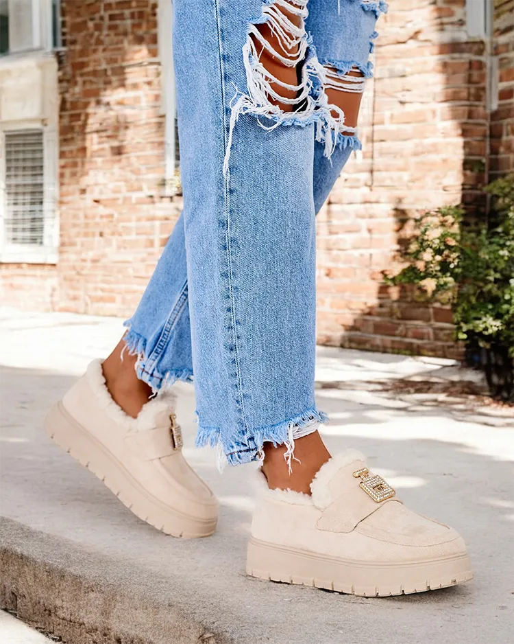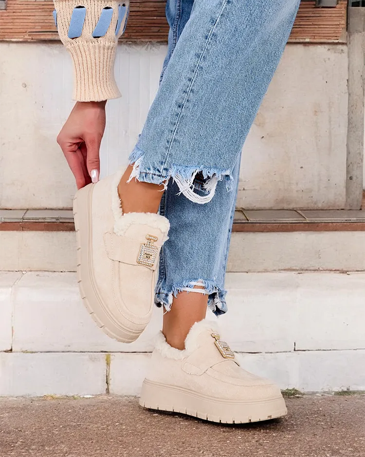 • Ogreti ženski mokasini s platformo. Klasičen model, izdelan iz semiš ekološkega usnja in podloge, ki spominja na ovčjo kožo. Podplat je v obliki platforme. Na zgornjem delu je pritrjen okras s cirkoni.