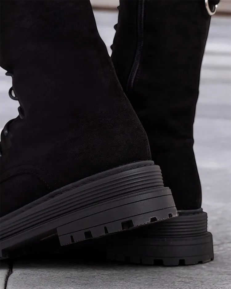 - Štýlové dámske čižmy z ekokože. Čižmy sú šnurovacie a zapínajú sa na zips. Model má plochú podrážku a kožušinovú výplň. Ideálne na jeseň!
