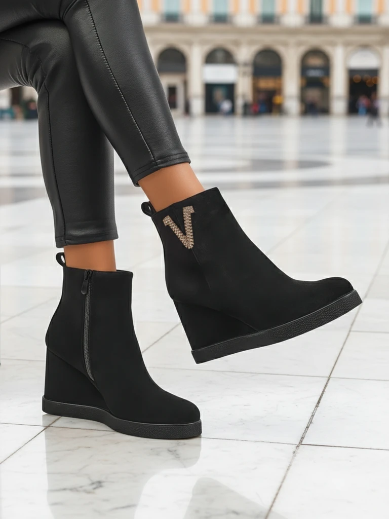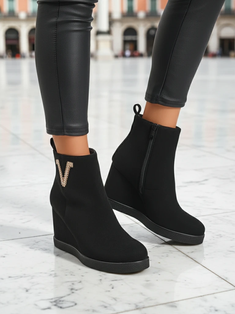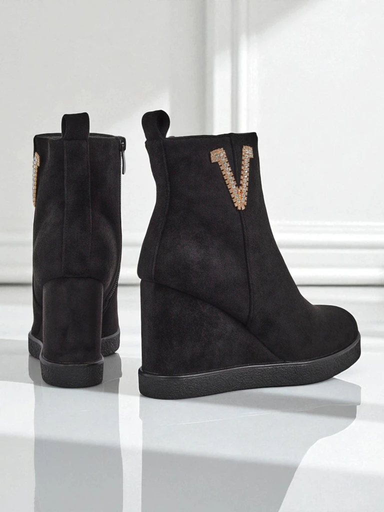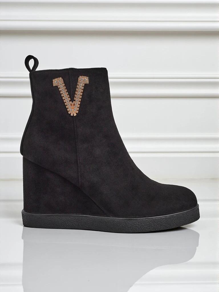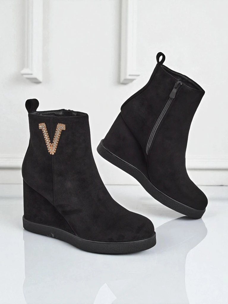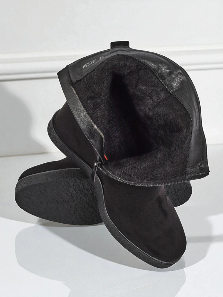 • Elegantné dámske čižmy na podpätku, vyrobené z eko-semišu. Obuv vyplnená kožušinou na vnútornej strane. Perfektná voľba na jeseň!