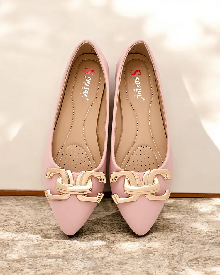 - Balerínky pre ženy na ploštom opätku vyrobené výlučne z eko-kože. Špička ukázaná a zdobená kovovou sponou. Skvelý doplnok k vašim každodenným outfitom!