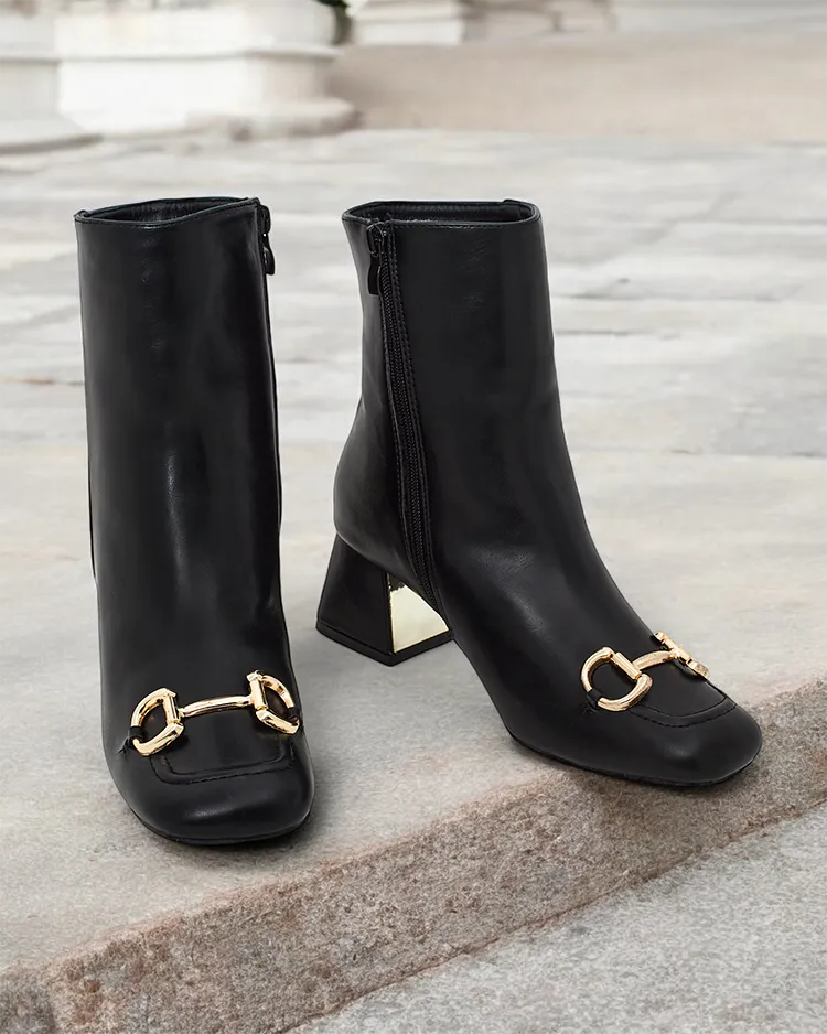 - Tieto štýlové dámske členkové topánky na pätici, vyrobené z ekokože, sú ideálnou voľbou pre chladnejšie dni. Model sa zapína zipsom, má štvorcový špičiak a elegantnú dekoráciu na špičke.
