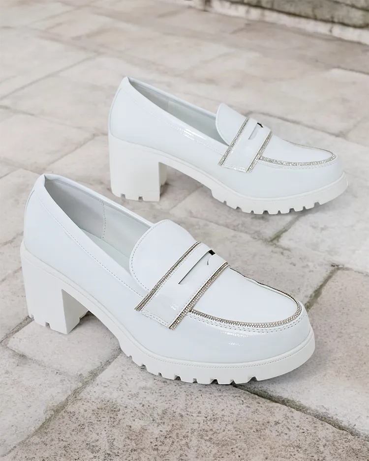 - Klasické dámske mokasíny s opätkom. Model je vyrobený z lakovaného koženého materiálu, stielka je vyrobená z imitácie kože. Topánky majú decentnú dekoráciu na vrchnej časti vo forme zirkónov. Ideálne na každodenné nosenie!