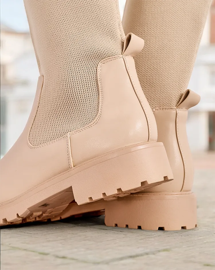 • Štýlové dámske topánky po koleno na hrubšej podrážke. Vrchná časť je vyrobená z flexibilného tkaninného materiálu s prvkami z ekokože, vnútri látková a kožušinová stielka. Model s jednoduchým zasúvaním. Ideálne pre každodenné jeseň outfit!