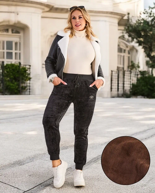 • Teplo ženské tepláky vyrobené z mäkkého materiálu podobného velúru. Model s jednoduchým strihom, má dve vložené vrecká a elastický pás s ťahacím šnúrkami. Vnútri je vyložené teplým polárnym fleece. Perfektná voľba pre každodenné nosenie!