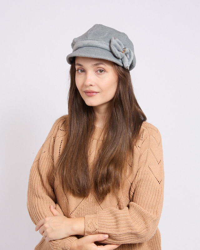 - Krásna dámska čiapka s šiltom vyrobená z príjemného materiálu na dotyk, zdobená mašľou. Klasický model, ktorý dokonale doplní jeseň štýlová!
