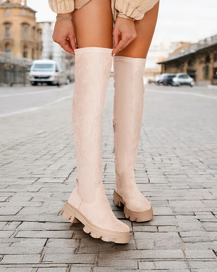 - Štýlové dámske ploché čižmy nad koleno. Vrchná časť je vyrobená z ekokože, s textílnou stielkou vnútri. Model na zasúvanie s uzatváraním na zips po polovici lýtkov. Ideálne pre každodenné jesenné outfity!