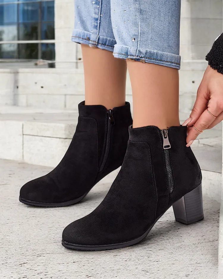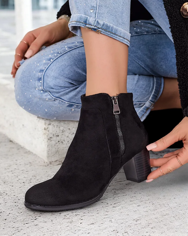 - Elegántne čižmy na malom opätku sú dokonalou kombináciou elegancie a pohodlia. Model je vyrobený z ekokože a má jemnú podšívkou, čo poskytuje štýlový vzhľad pre akúkoľvek príležitosť. Obuv má dekoratívny zips a odierky na strihu.