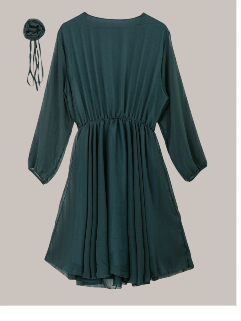• Elegantné, nadčasové dámske šaty po kolená s obalom na krku a elastickým pásikom. Šaty majú dlhé rukávy z mriežky a dekoratívnu prídavnú mašľu s kvetom. Skvelá voľba pre večerné vychádzky!