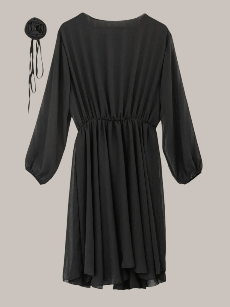 - Elegantné, nadčasové dámske šaty po koleno s prekrytým výstrihom a elastickým pásikom v pase. Šaty majú dlhé rukávy z mriežky a dekoratívny dodatočný pásik so kvetom. Skvelá voľba na večer!