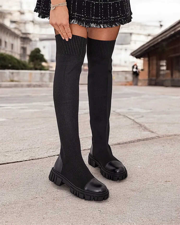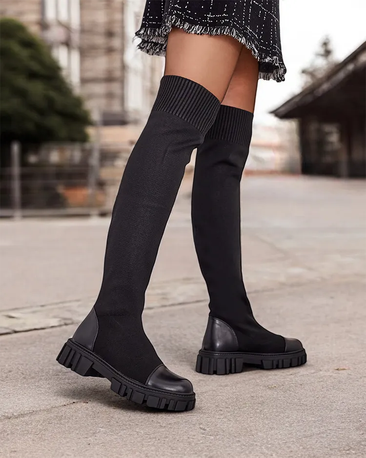 • Štýlové dámske nadkolenné čižmy na hrubšej podešve. Zvršok je vyrobený z pružného látkového materiálu s eco koženými vložkami, s látkovou stielkou vnútri. Model slip-on. Ideálne na každodenné jesenné outfity!
