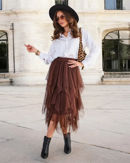 - Časovo neobmedzená dvojvrstvová midi sukňa pre ženy. Model má podšitie a tyl vo forme siete, ako aj široký, elastický pás, ktorý dokonale zdôrazňuje pás. Táto sukňa je skvelým doplnkom k vášmu každodennému vzhľadu!