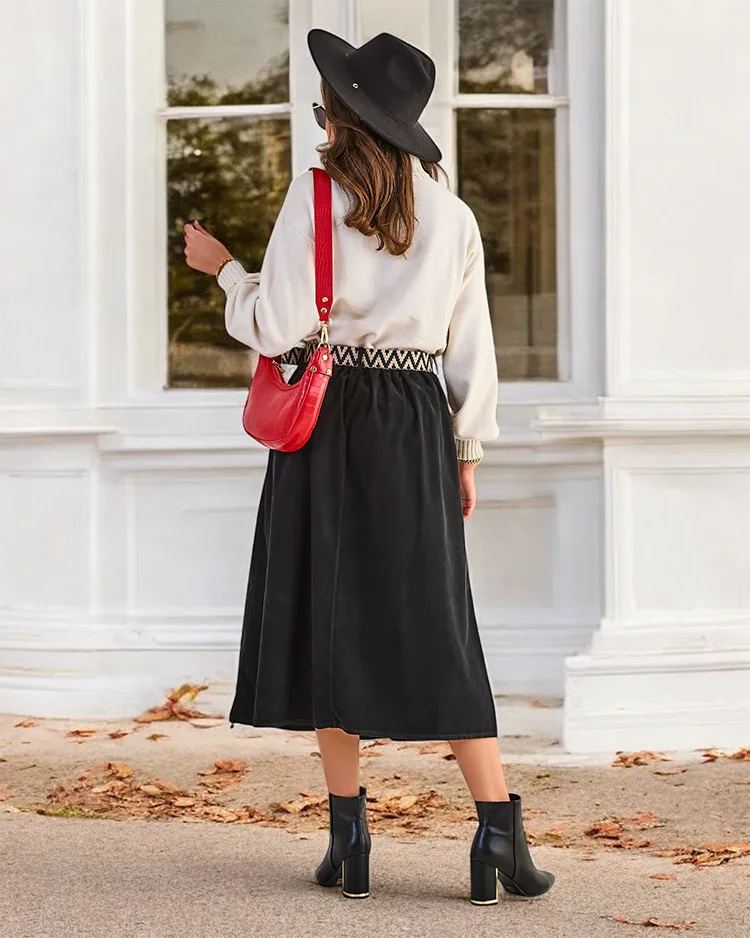 - Dámska midi sukňa vyrobená z mäkkej látky pripomínajúcej svojákovinu. Model je dodávaný s opaskom. Ideálna základňa pre mnoho jedinečných outfitov! POZNÁMKA: Presnosť merania (+/-) 1 cm.