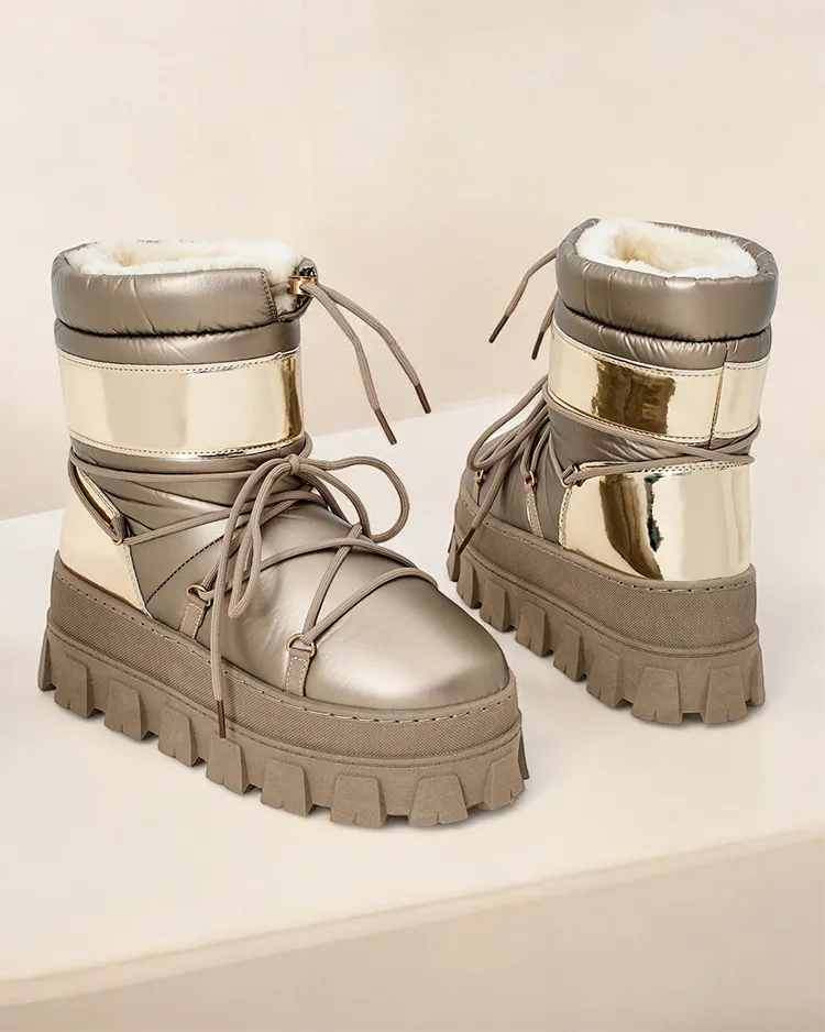 - Dámske snehule s hriadeľom vyrobeným z kombinácie látky pripomínajúcej voskovú plachtu a patentového ekokože. Vnútri je príjemný kožušinový podšívka, slip-on a topánky na zaväzovanie. Ideálne na zimu!