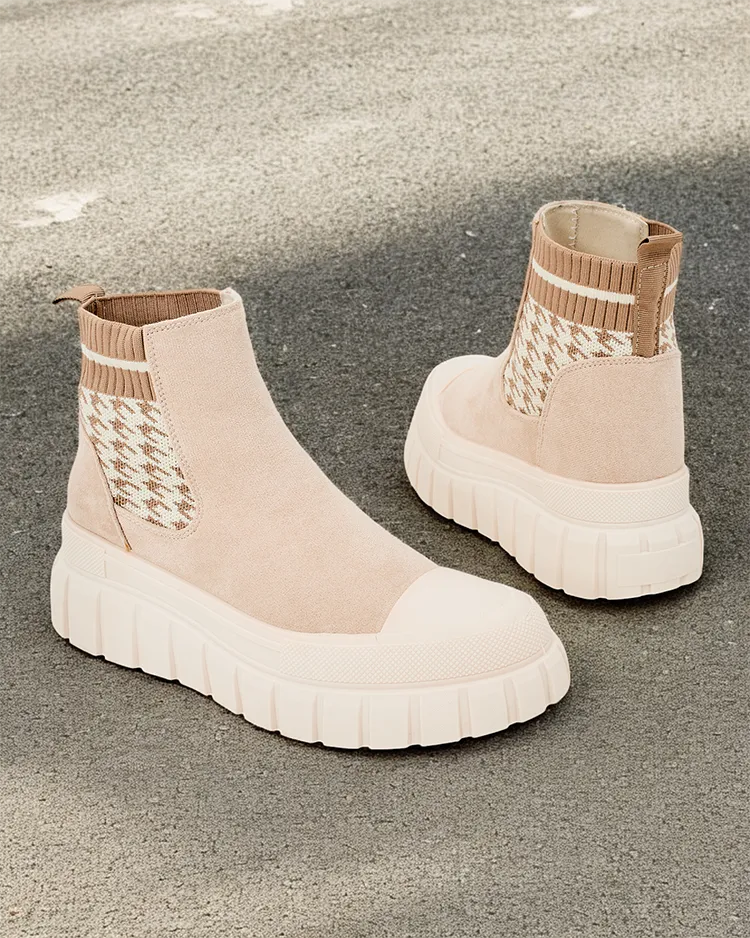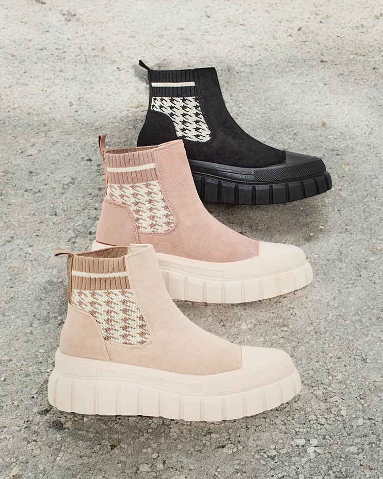 - Dámske platformové členkové topánky vyrobené z umelého kožušiny podobnej semišu. Topánky na nasunutie, vnútro vyrobené z pohodlnej látky. Ideálne na jeseň!