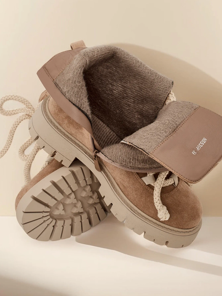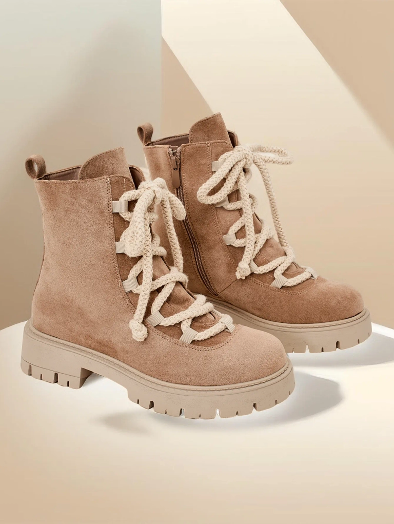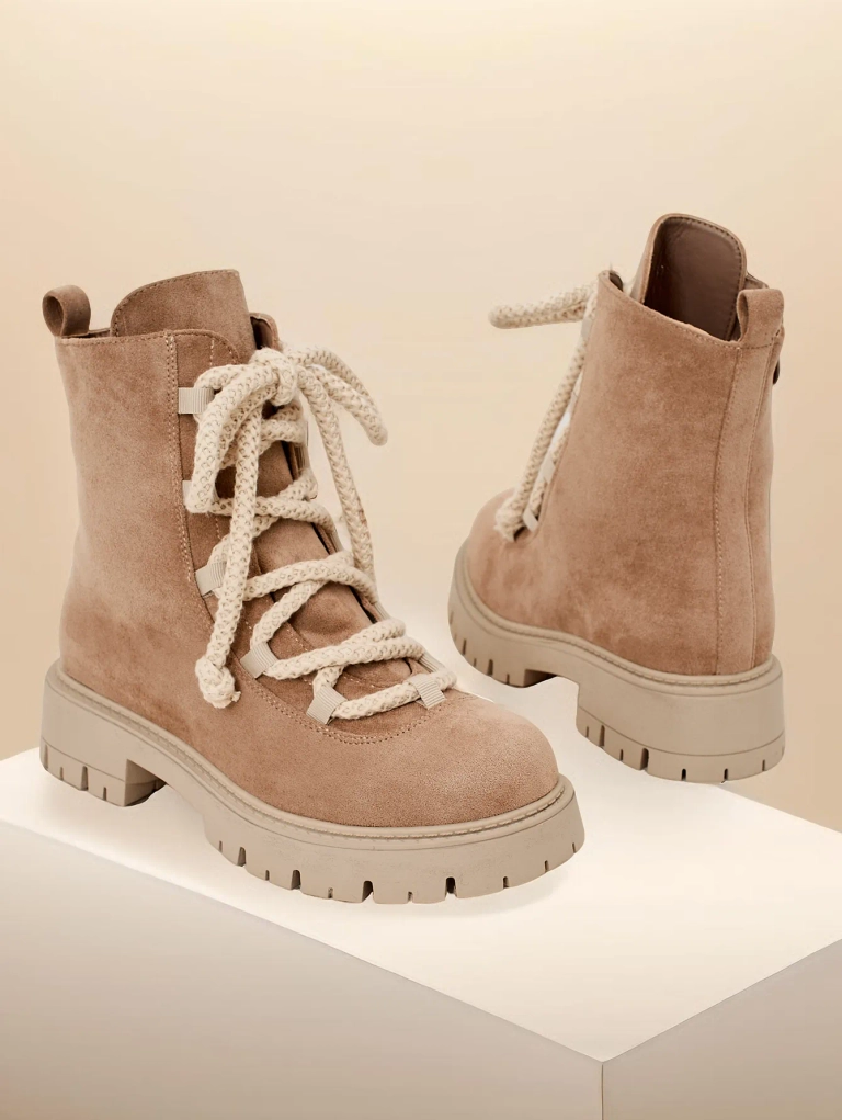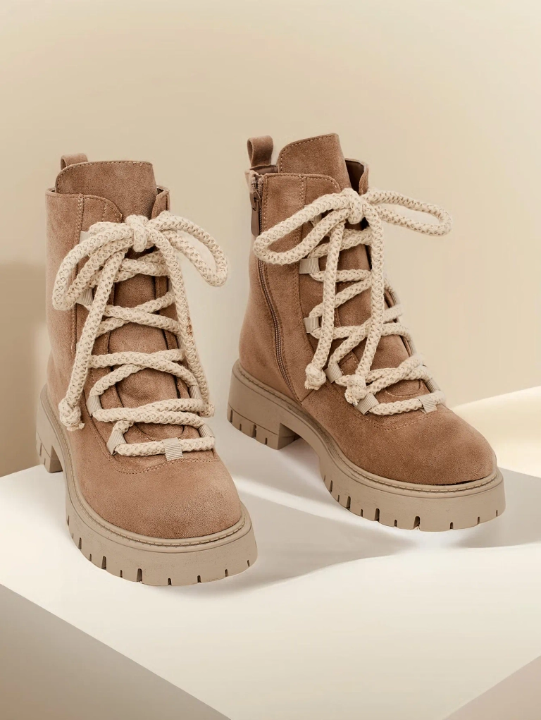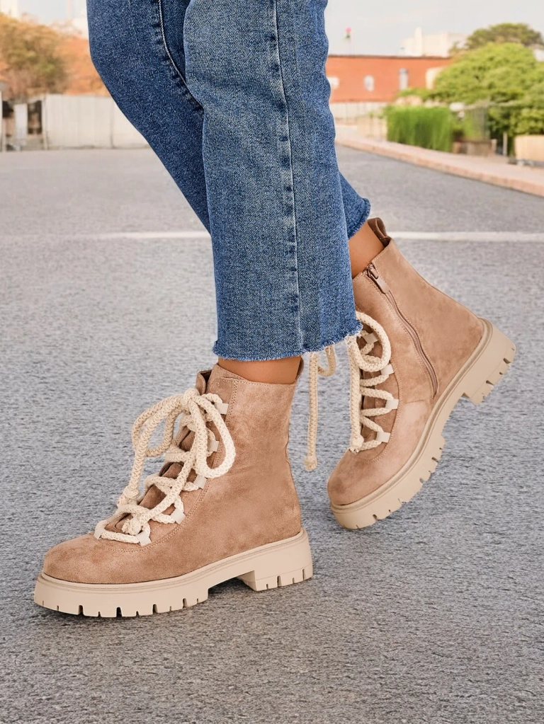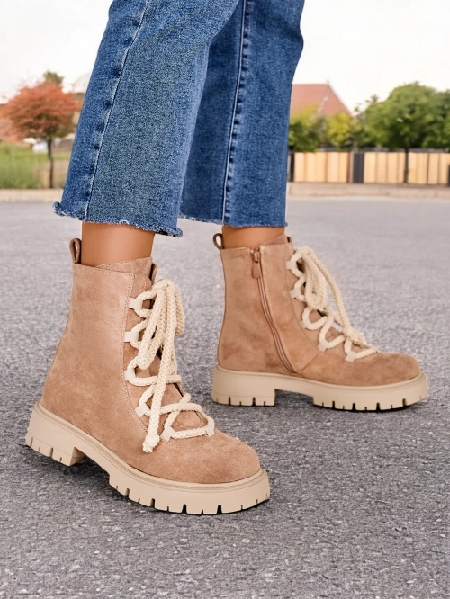 • Štýlové šnurovacie členkové topánky vyrobené z ekokože z semišu. Topánky sú zavinovacie a zipsom zaväzované. Model má hrubšiu podrážku a futro. Ideálne pre jeseň!