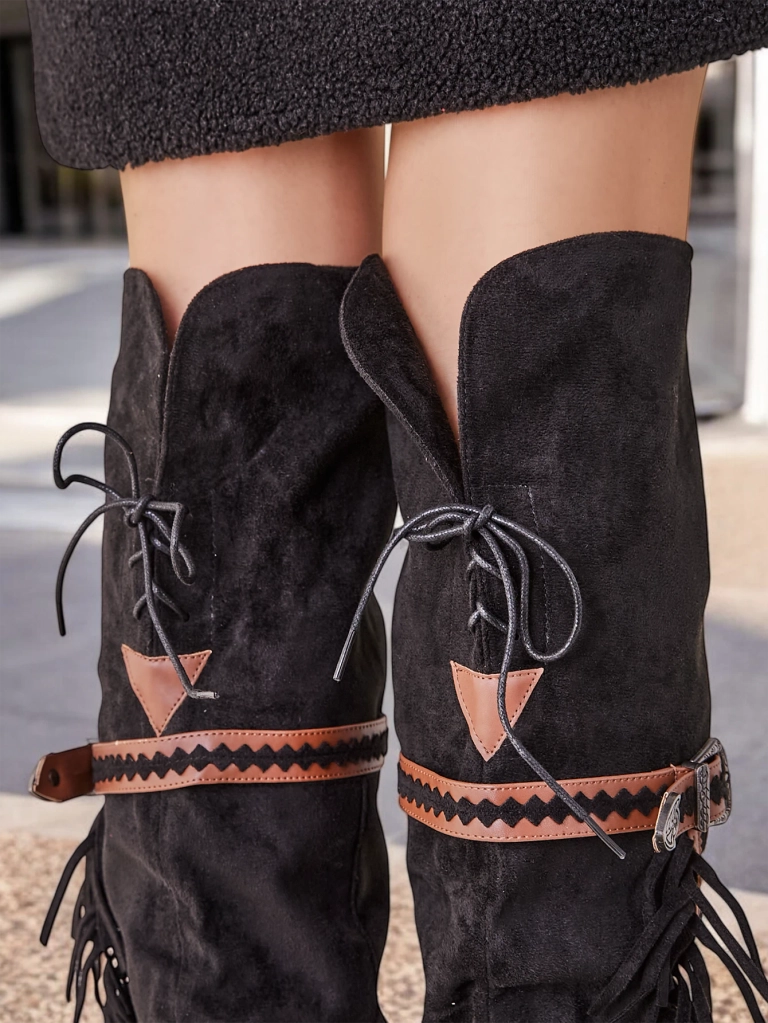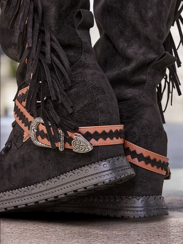 - Štýlové ženy nadkolenné čižmy s ukrytým klínovým podpätkom. Horná časť je vyrobená z eko-zamszovej kože. Textilná podšívka. Návrh na nasunutie, zdobený resami a potlačenými remienkami.
