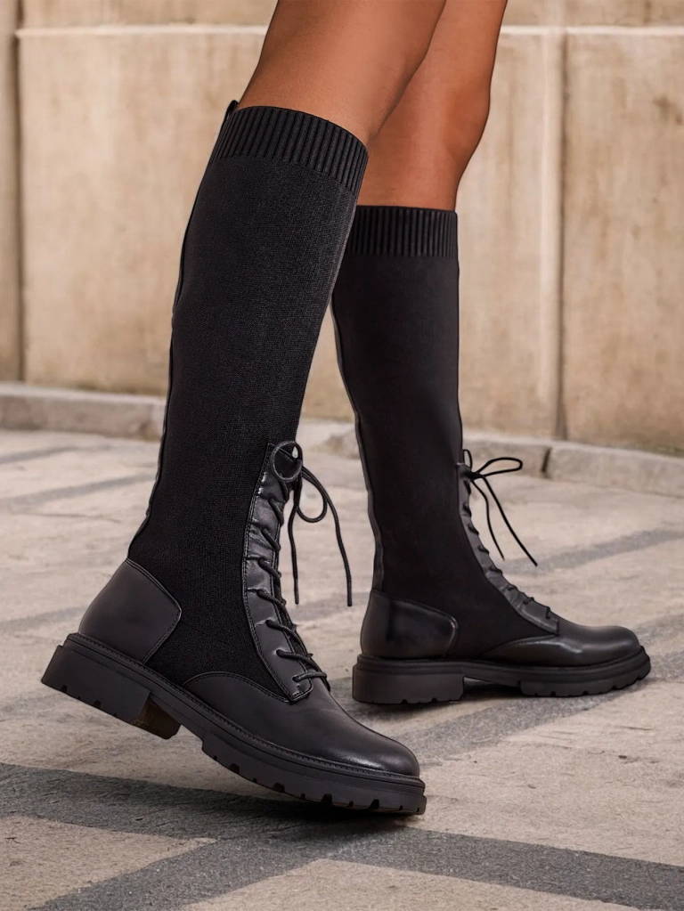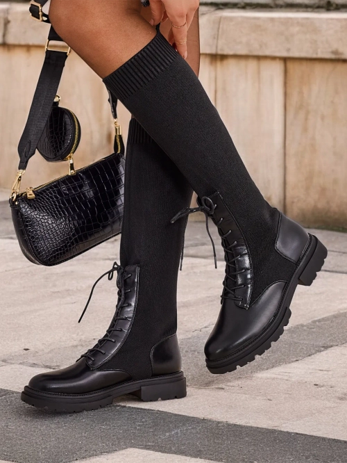 • Štýlové dámske čižmy na hrubšej podrážke. Horná časť je vyrobená z flexibilného látkového materiálu, s látkovou stielkou vnútri. Model Slip-on, s dekoratívnymi šnurovaním. Ideálne pre každodenné jesenné outfity!