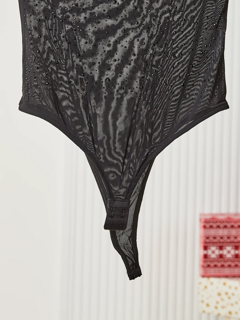 - Tielsko vyrobené z mriežky s cirkónmi, ktoré dodávajú eleganciu. Dlhé rukávy pridávajú jemnosť. Zaviazanie pomocou háčikov zaručuje perfektné priliehanie. Ideálne pre večer plný sofistikovaného lesku. POZOR: Presnosť merania (+/-) 1 cm.