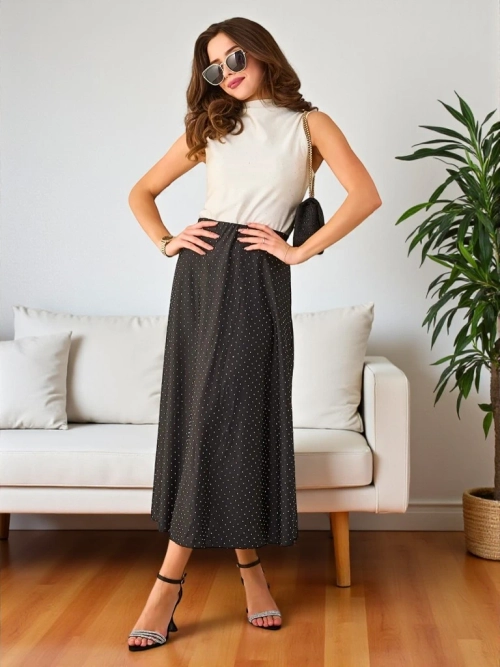 - Dámska midi sukňa vyrobená z mäkkého materiálu. Model je zdobený flitrami po celej dĺžke. Ideálna základňa pre mnoho jedinečných outfitov! POZNÁMKA: Presnosť merania (+/-) 1 cm.