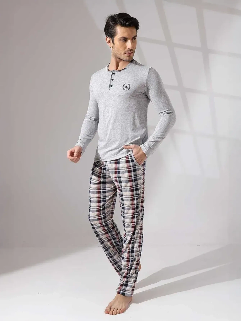 - Elegantné pánske pyžamá s unikátnym potlačou a kockovanými nohavicami. Vyrobené z vysoko kvalitnej bavlny, zaručujú pohodlný spánok a štýlový vzhľad. UPOZORNENIE: Presnosť merania (+/-) 1 cm.