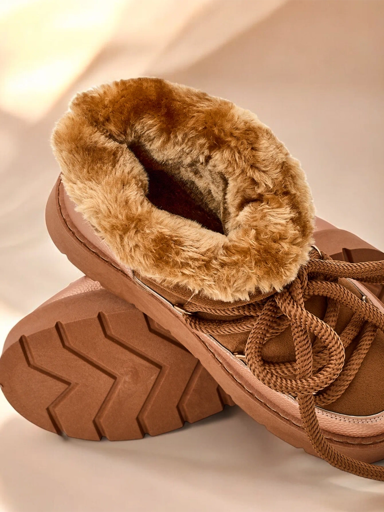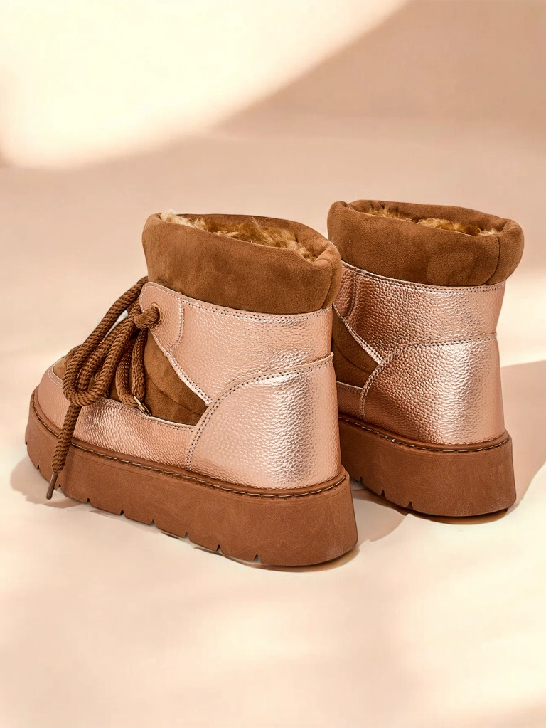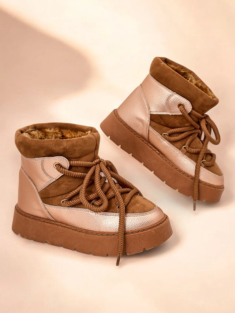 - Dámske čižmy na sneh s hlienkou vyrobenou z kombinácie eko kože a eko semiše. Vnútri príjemný kožušinový náter, topánky na zacvakávanie i viazanie. Ideálne na zimu!