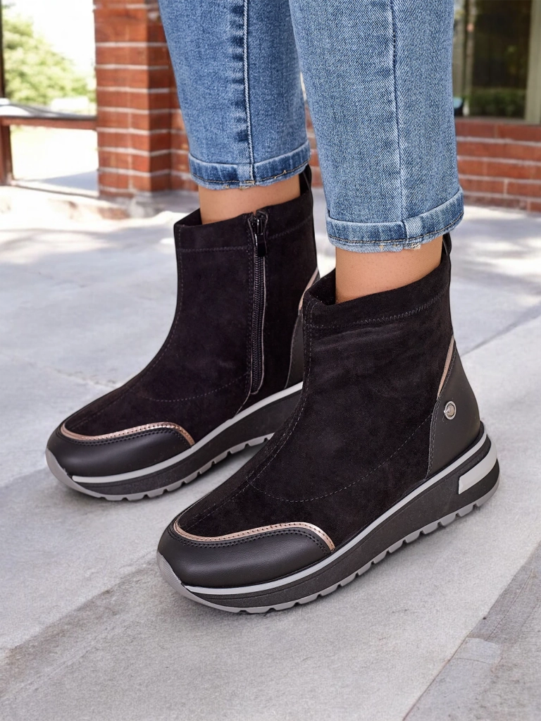 - Dámske platformové členkové topánky, vyrobené z ekokože z semišu. Topánky sú zapínané zipsom, vnútri vyložené pohodlným kožušinčekom. Ideálne na jeseň!