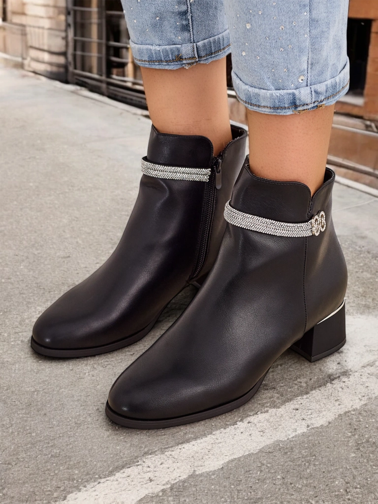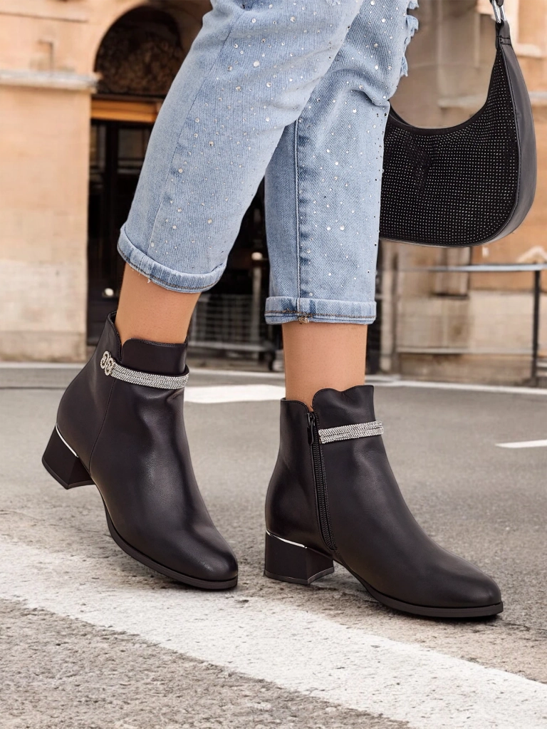 • Vynikajúce dámske topánky s nízkymi opätkami, vyrobené z lakovanej ekokože. Vnútro je vyložené jemným kožuchom. Model je zapínaný zipsom. Majú dekoráciu so zirconi. Perfektné pre jesenné outfity!