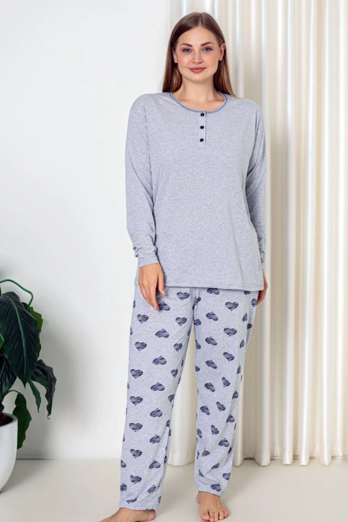 - Dámska 2-dielna pyžamová súprava vyrobená z bavlnenej látky s dekoratívnym srdcovým potlačou. Súprava obsahuje dlhý top s dlhými rukávmi a nohavice s elastickým pásikom a priamymi nohavicami.