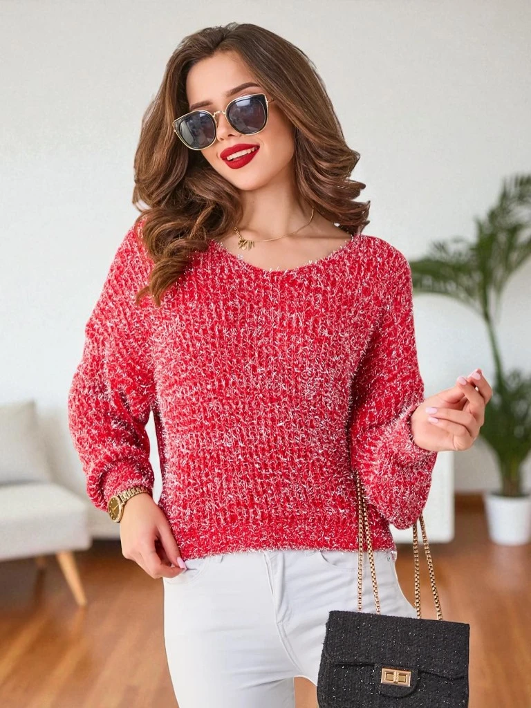 • Tento štýlový sveter je esenciou pohodlia a pôvabu. Vyrobený z mäkkého materiálu, sveter má výstrih do V a dlhé rukávy. Voľný strih a lesklá niť mu dávajú jedinečný šarm!